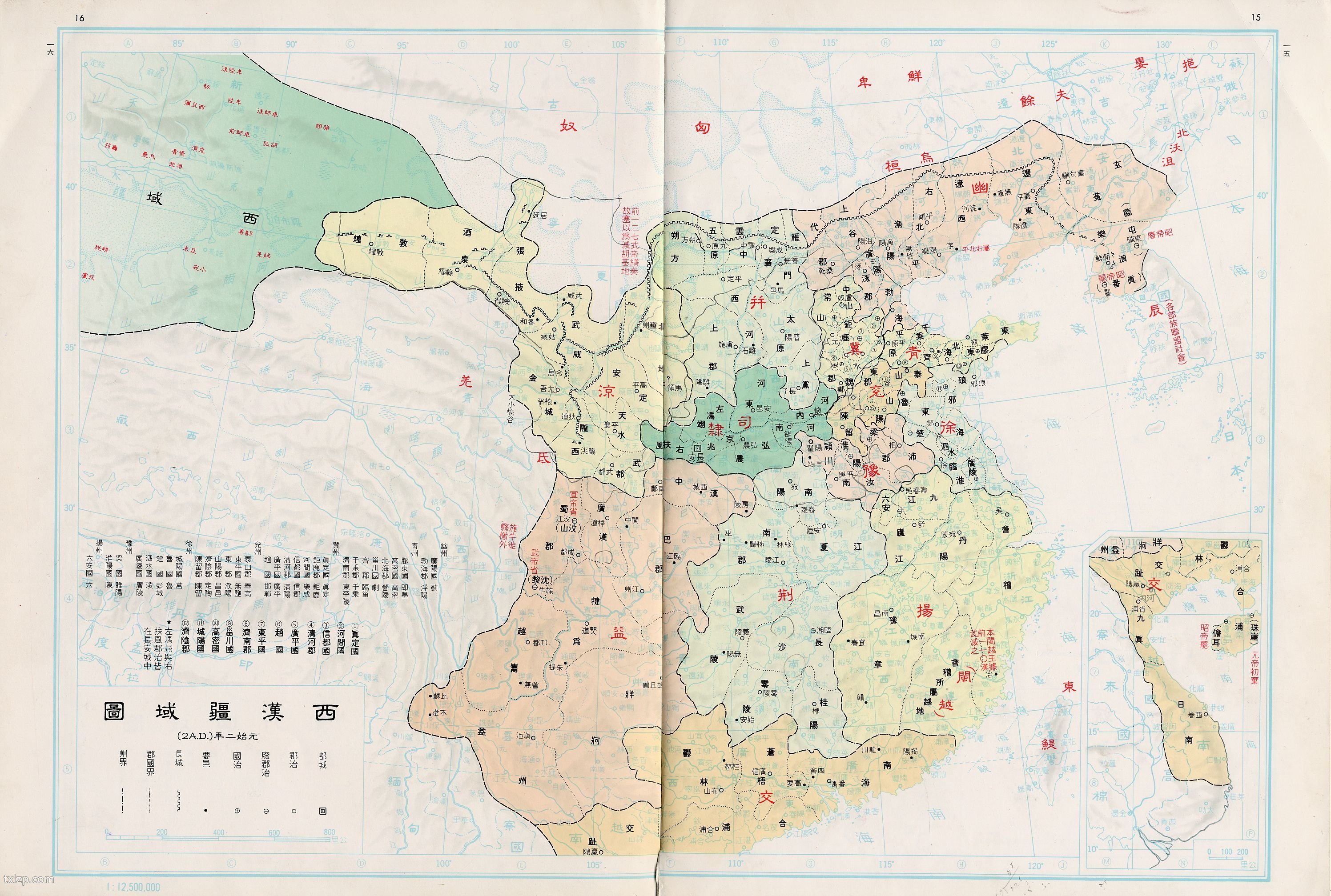 西汉疆域图(公元2年) 2021年11月5日 下载 ⭐ 收藏文章 我的收藏 此西汉疆域图为公元2年前后的地图。 西汉,是中国历史上的大一统王朝,共历十二帝,享国二百一十年,即公元前202年至公元8年 ,又称为前汉。西汉极盛疆域东并朝鲜、南据交趾、西逾葱岭、北抵大漠,国土面积达609万平方公里。 ⭐ 收藏文章 我的收藏 分类:汉朝地图 标签: 相关推荐 《禹贡九州图》 东汉形势图 公元140年 西汉形势地图 公元7年 东汉疆域图 汉代西域图 汉代匈奴图 查看更多相关推荐