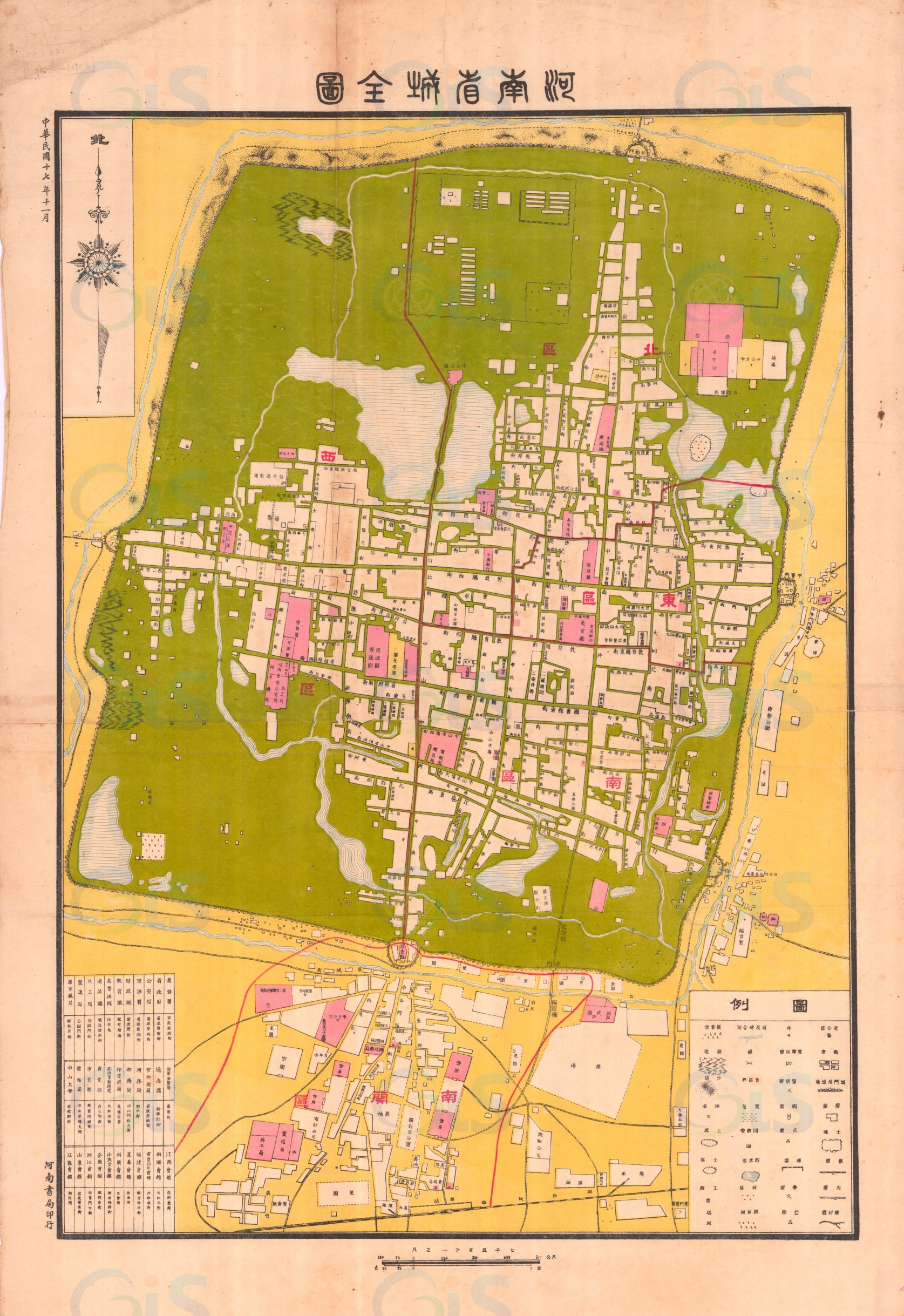 此《河南省城全图》为民国17年(1928年)11月发布的开封市街地图,比例尺:1/7500彩色地图,地图由河南书局印行,现藏中研院。