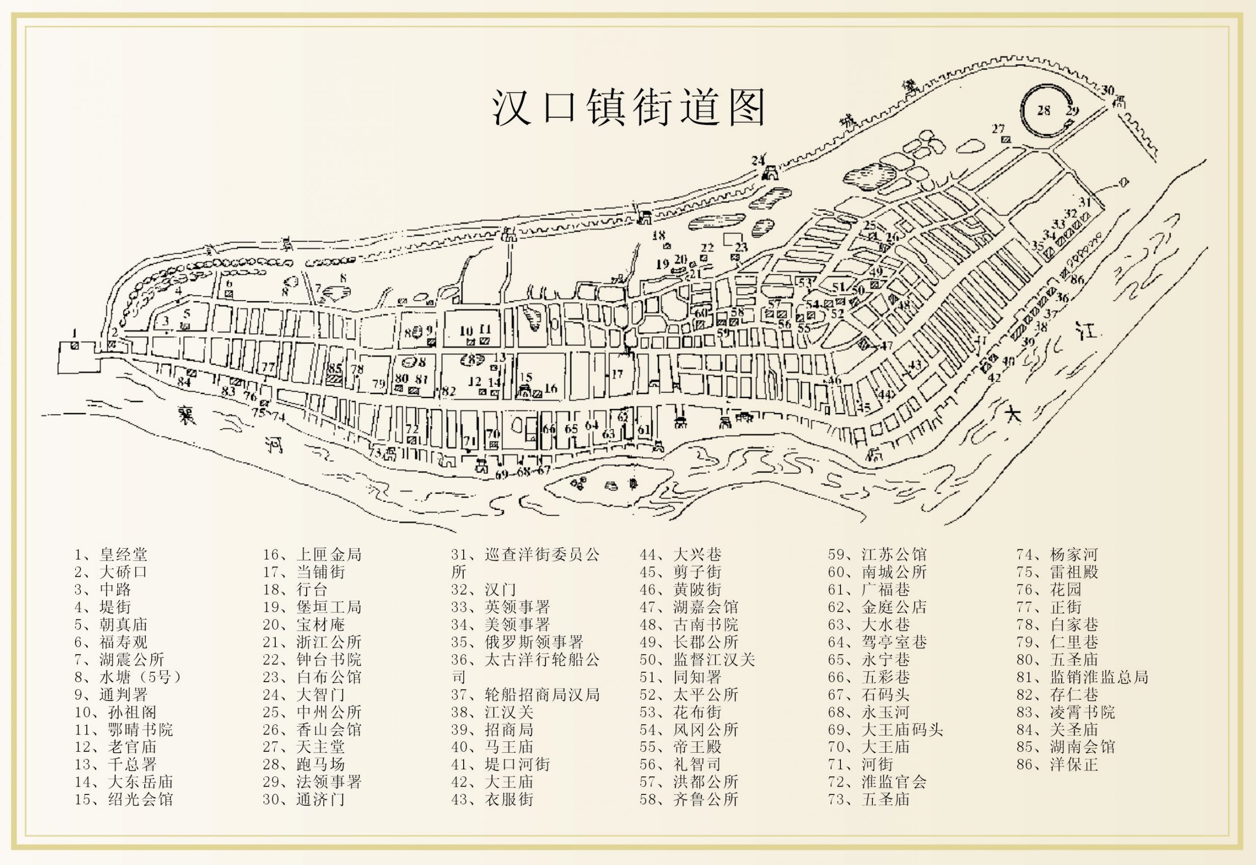 此《湖北汉口镇街道图》为光绪3年(1877年)绘制的汉口城厢地图。地图中标注出86个主要地点(名所),展示晚晴时期的汉口街市道路分布。