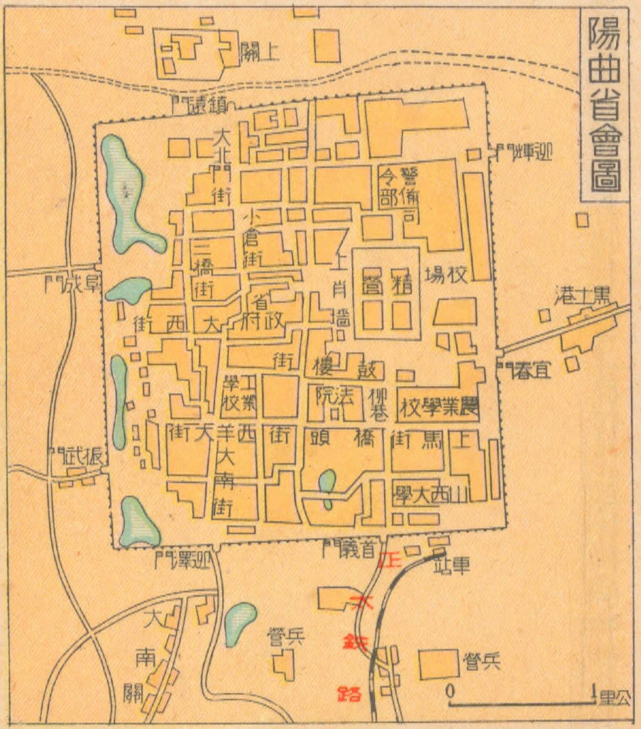 本《阳曲省会图》(太原)出自1941年《山西分县详图》,由上海亚光舆地学社出版。地图比例尺:1/141万,地图主要绘制的山西省会太原的简略城厢图。