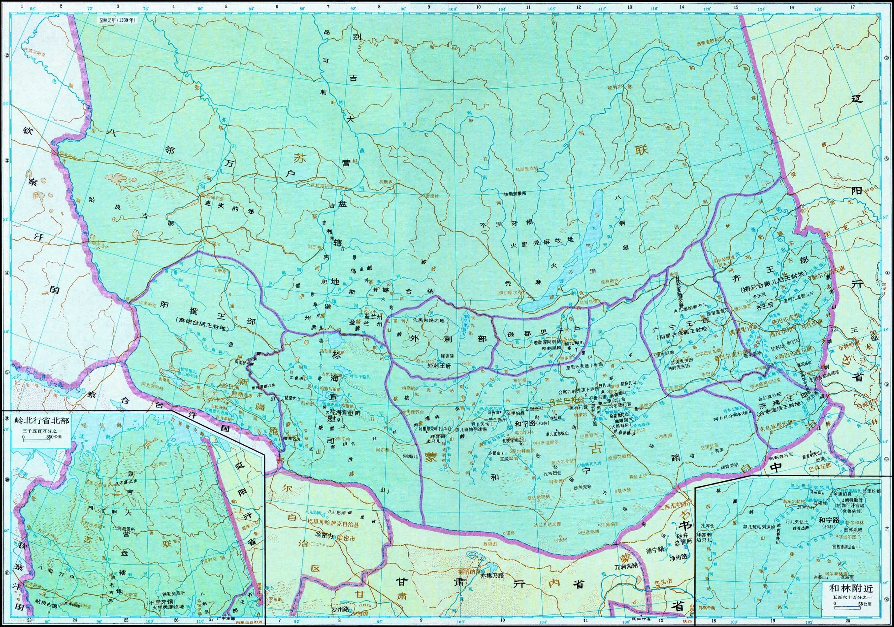元代 岭北行省地图 2021年11月5日 下载 ⭐ 收藏文章 我的收藏 元代 岭北行省 地图全图高清版 岭北行省,全称岭北等处行中书省,是元朝最北方的行省。治和林,北至北海之地,西南至也儿的石河(额尔齐斯河古称),西接钦察汗国和察合台汗国;东南至哈剌温山(今大兴安岭),以勒拿河东接辽阳行省;凡属元朝的林木中百姓和诸王地等均归统辖。统辖漠北、漠西诸地,南隔大漠与中书省和甘肃行省辖地接。 ⭐ 收藏文章 我的收藏 分类:元代, 新疆 标签: 相关推荐 1910年乌鲁木齐老照片 莫理循西北行之乌鲁木齐篇 1914年德国考察队吐鲁番行拍摄的老照片(下) 1914年德国考察队吐鲁番行拍摄的老照片(上) 《俄国科学贸易考察团的中国之旅》1874-1875年 影集下载 《伯希和中亚考察团摄影集》1906至1909年 影集下载 新疆乌鲁木齐历史地图大全 查看更多相关推荐