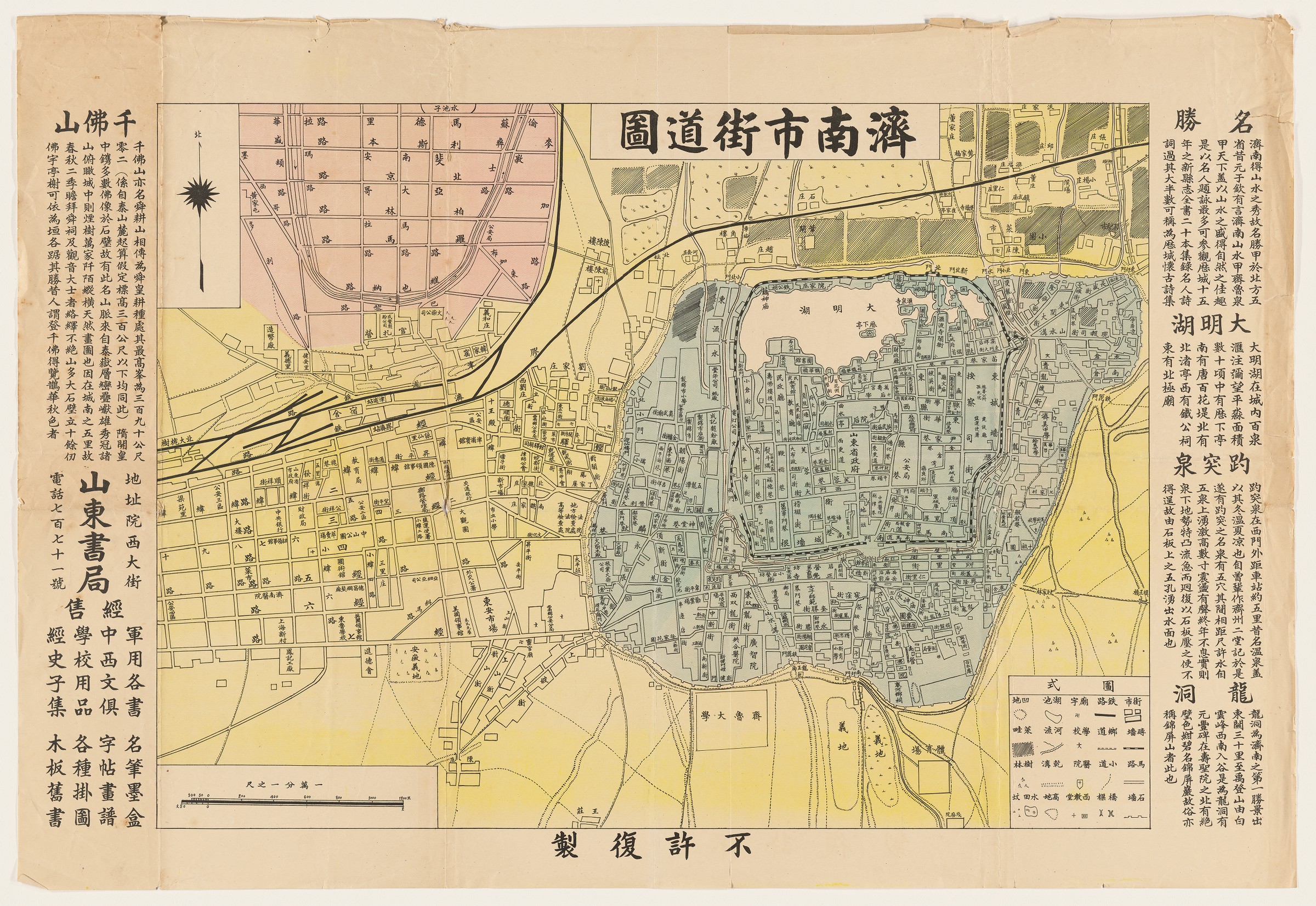 1932年《济南市街道图》 2022年3月8日 下载 ⭐ 收藏文章 我的收藏 此《济南市街道图》为1932年发行的1/10000济南城市街道地图。地图两侧还有济南名胜大明湖、趵突泉、龙洞、千佛山的介绍及山东书局广告。其它信息较少 强烈推荐:20余幅高清济南老地图打包下载 地图预览: 点击图片可以打开大图查看 ⭐ 收藏文章 我的收藏 分类:山东, 民国地图 标签:济南 相关推荐 1920年代济南老照片(上) 百年前大明湖趵突泉等 卡恩拍摄清末中国最早彩色照片集 1912-1913年 《山东省动乱纪念写真帖》1928年 影集下载 1947年《济南市街道详图》 1999年《济南市交通旅游图》 1911年《济南城区图》 查看更多相关推荐