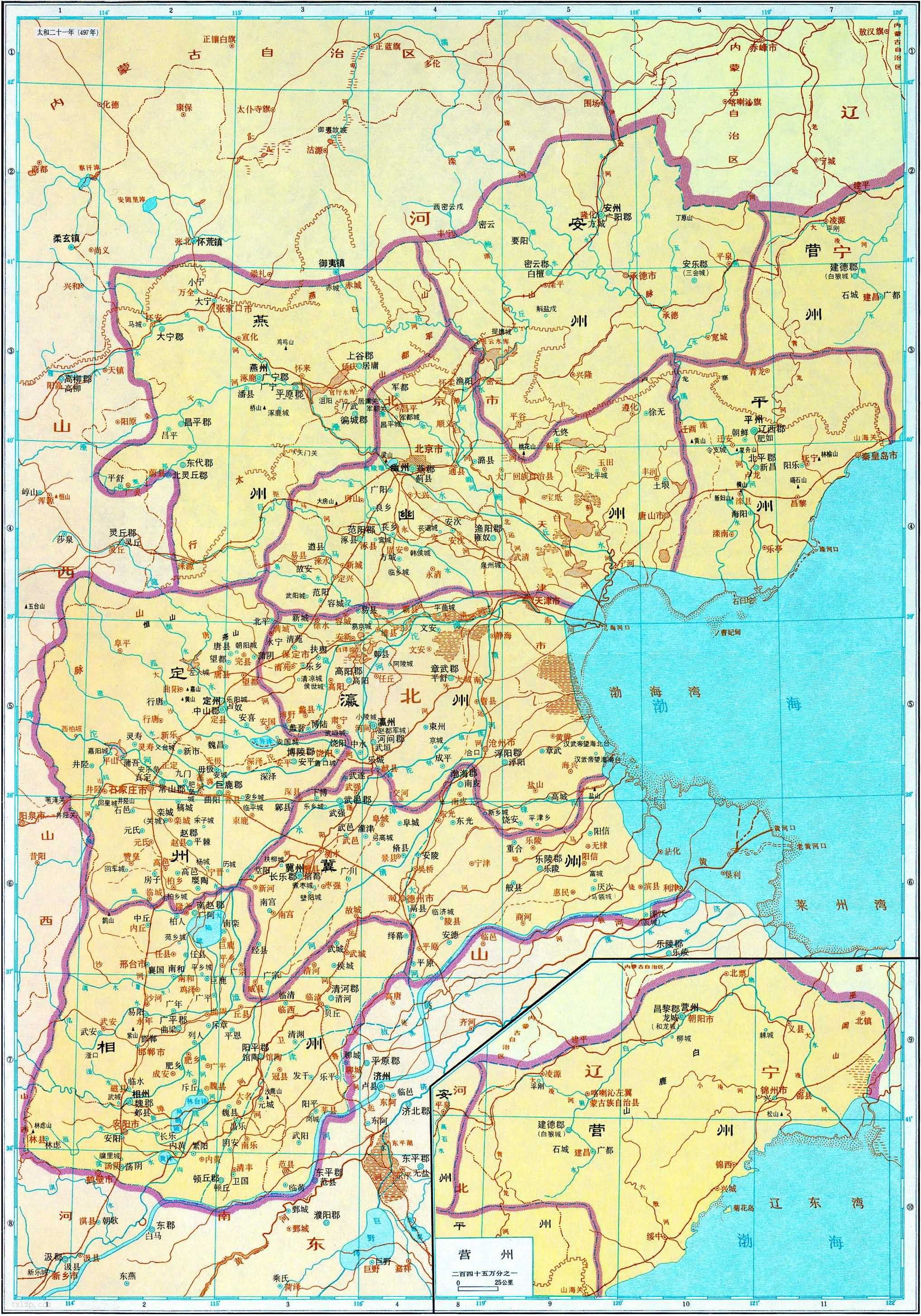 北朝魏 相州、冀州、幽州、平州历史地图 2021年11月5日 下载 ⭐ 收藏文章 我的收藏 南北朝时期北魏 相州、冀州、幽州、平州等地历史地图 魏疆域广阔,主要控制着中国北方地区,北至沙漠、河套,南至江淮,东至海,西至流沙。北魏实行州、郡、县三级制, 相州、冀州、幽州、平州等地区在今天的河北、辽宁、山东部分地区。 ⭐ 收藏文章 我的收藏 分类:南北朝地图 标签: 相关推荐 322年东晋《吴郡康城地域图》 南北朝 陈 齐 周国形势地图 南北朝 梁与东西魏形势地图 南北朝 齐魏形势地图(488年) 南朝齐 交州地图全图 三国时期鲜卑等部地图 查看更多相关推荐