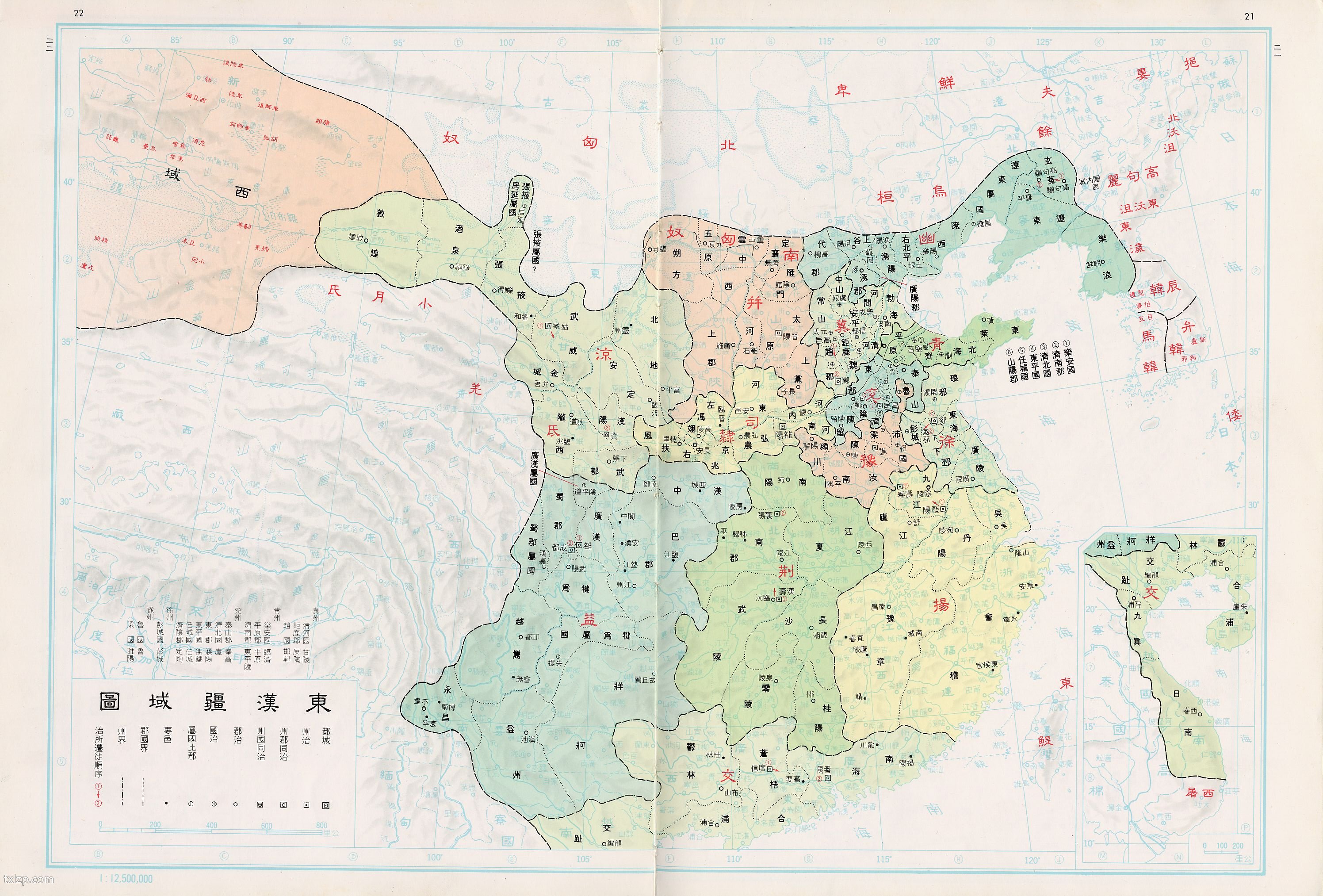 东汉疆域图 2021年11月5日 2026年4月1日 下载 ⭐ 收藏文章 我的收藏 该《东汉疆域图》出自台湾中国文化大学出版的中国历史地图,仅供参考。 东汉疆域: 建武二十四年(48年)南匈奴内附并被安置于河套,又于建武二十六年(50年)置匈奴中郎将监护南匈奴降部。 建武二十五年(49年)乌桓率众内属,内迁于北部诸郡之北,又置乌桓校尉监护乌桓并兼领鲜卑。;汉明帝永平十二年(69年)哀牢内附,以其地置永昌郡,西南得以扩充至大盈江一带。至汉和帝永元六年(94年)彻底平定西域,西境抵海滨。 ⭐ 收藏文章 我的收藏 分类:全国地图, 汉朝地图 标签: 相关推荐 1944年《湘粤桂形势图》 1875年《地球五大洲全图》 1632年袁启《大地圆球五洲全图》 1946年《最新东北九省图》 1894年《清国新地图》 1947年《中华民国主要矿产图》 查看更多相关推荐