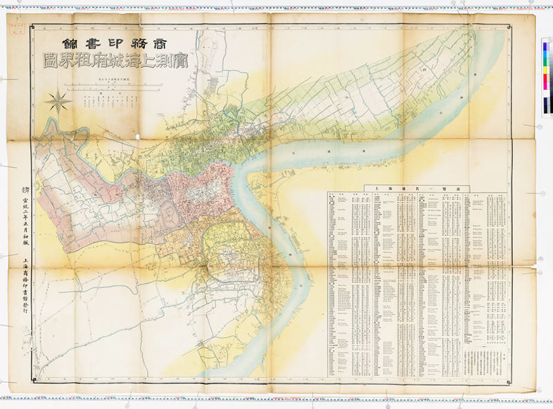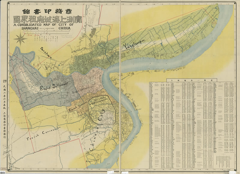 此《实测上海城厢租界图》为宣统2年(1911年)正月由商务印书馆出版发行,比例尺为1:12000。