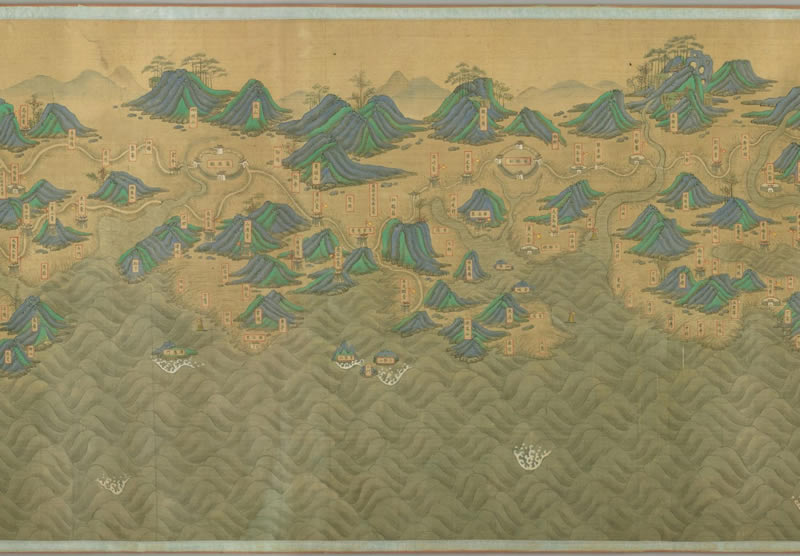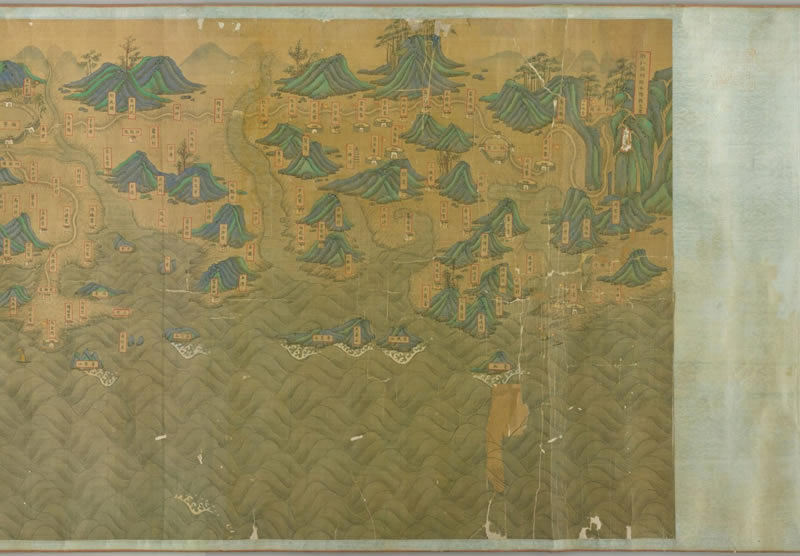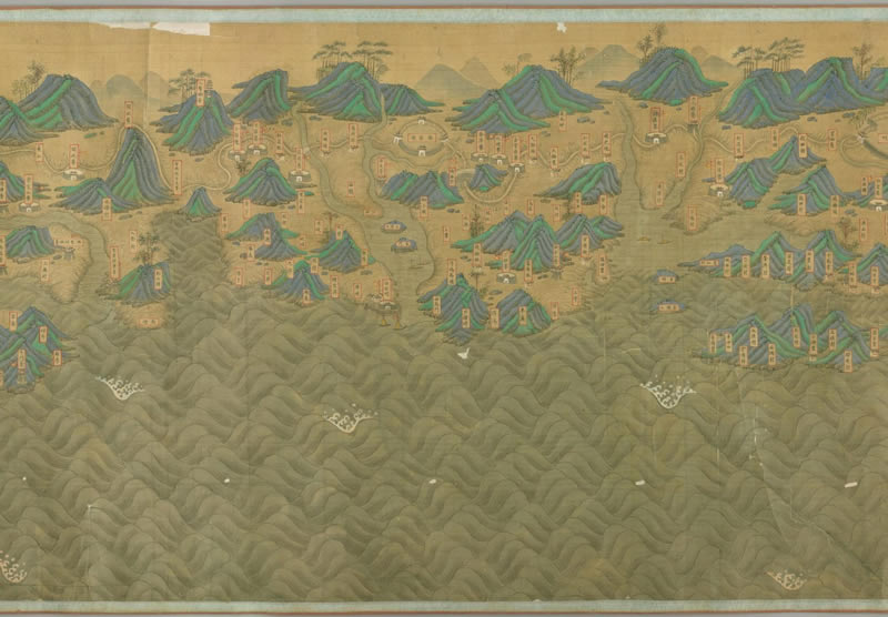 此《福建省海岸全图》大约绘制于清代初期,作者不详。全卷由右向左,由北至南,以表现福建沿海地区军事驻防为主,描绘了福建沿海的城、府、卫、所、寨、堡、墩、台、炮台、铺、村、驿站、港湾、口岸等。此卷为绢本青绿设色,主画约 60×1060 厘米,现藏于日本国立国会图书馆。卷末有伪仇英题款:十洲。