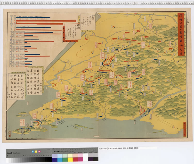 此《满洲方面日露陆战概见图》(日露战争鸟瞰图) 为日本关东军司令部昭和2年(1927年)3月10日调制。原图应该是1904年出版,地图出自日文研。