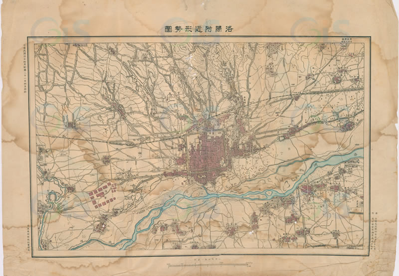 此《洛阳附近形势图》为民国4年测量民国21年(1932年)四月印刷的河南洛阳及周边形势图,由参谋本部陆地测量总局绘制,比例尺: 1/25000,原件尺寸: 58.4 * 43.5 (cm),多色彩图,现藏中研院。