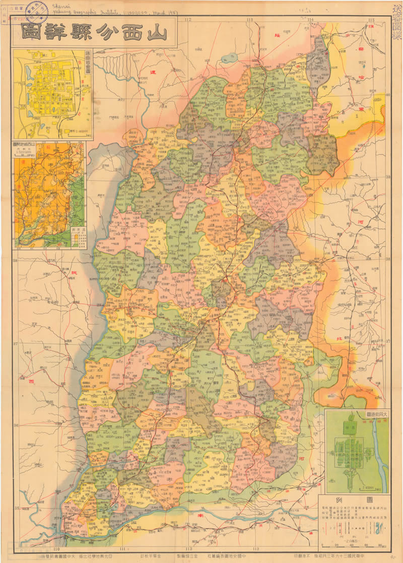 此《山西分县详图》行政区图中绘有简略县界、铁公路、河川,主图中无地形资料,另地图还附有大同、阳曲(太原)城区附图,及简略分层设色地形附图,十分珍贵。