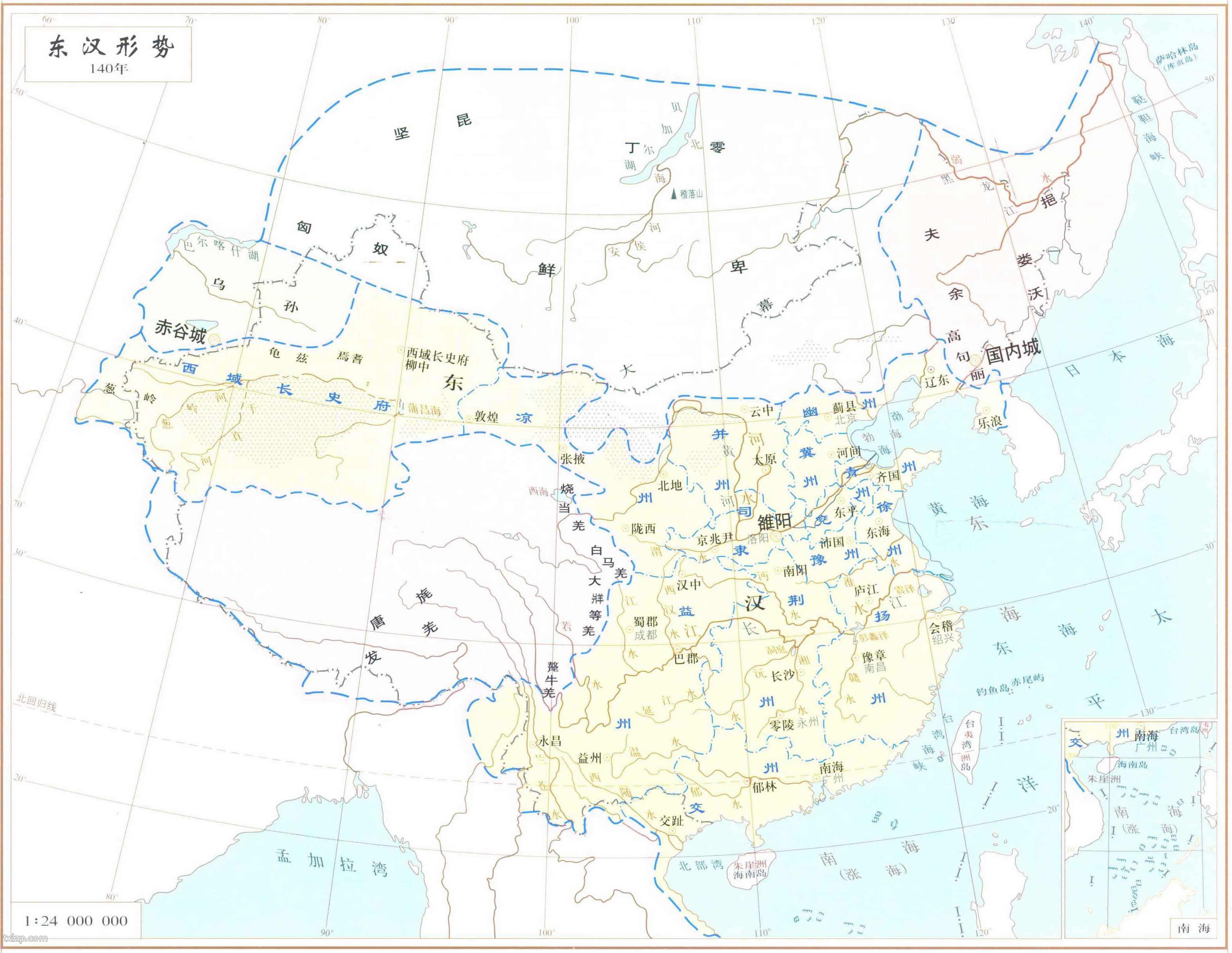 公元25至220年,是中国历史上的东汉时期。都雒阳(今河南洛阳)。本东汉形势图为公元140年的形势地图。