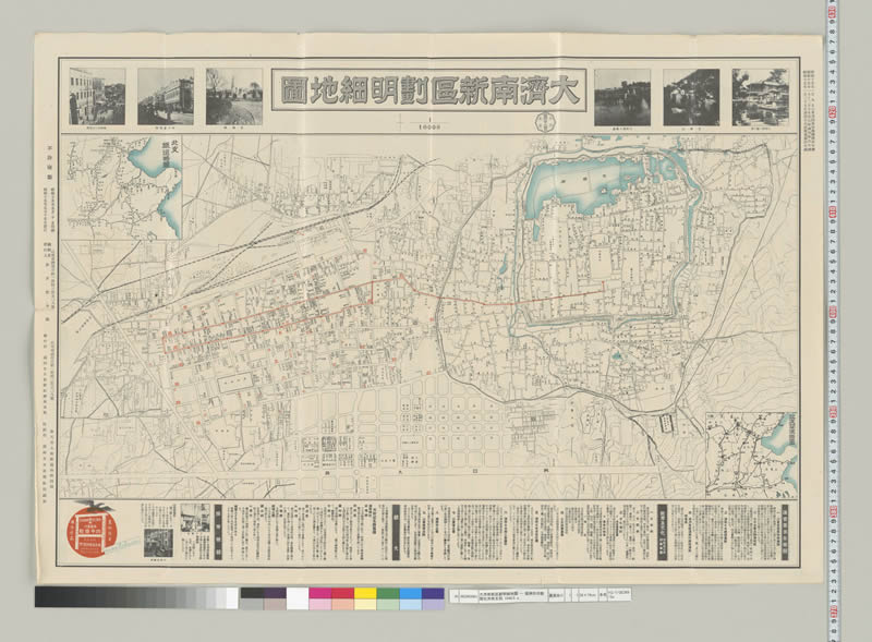 此《大济南新区划明细地图》为昭和十五年(1940年)印制,地图长约80厘米宽50多厘米,图上标题为《大济南新区划明细地图》,比例是1:10000,为双面三色影印,标题两旁分别是济南大明湖、千佛山、商埠、二大马路等景观照片。