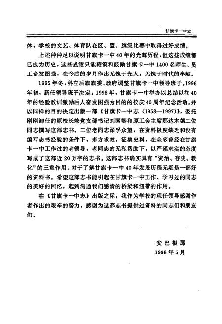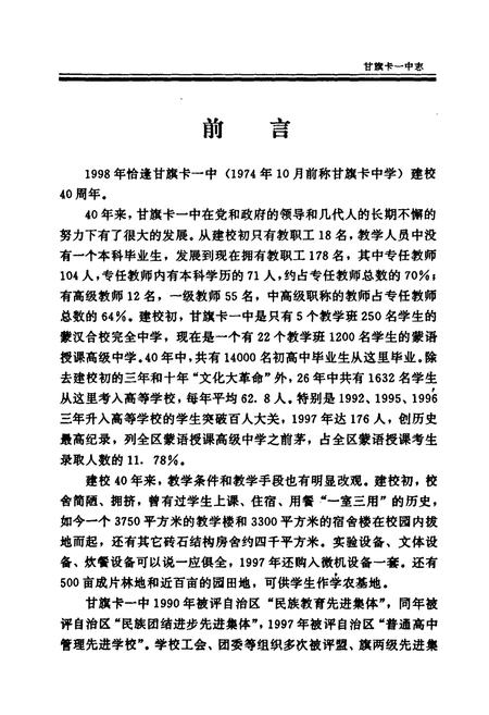 内容简介:一、《甘旗卡一中志》的编写以马列主义、毛泽东思想为指导,以党的十一届三中全会以来的路线、方针、政策和中共中央《关于建国以来党的若干历史问题的决议》为准绳,本着实事求是的原则,突出学校特色,力求思想性、科学性与资料性的统一。