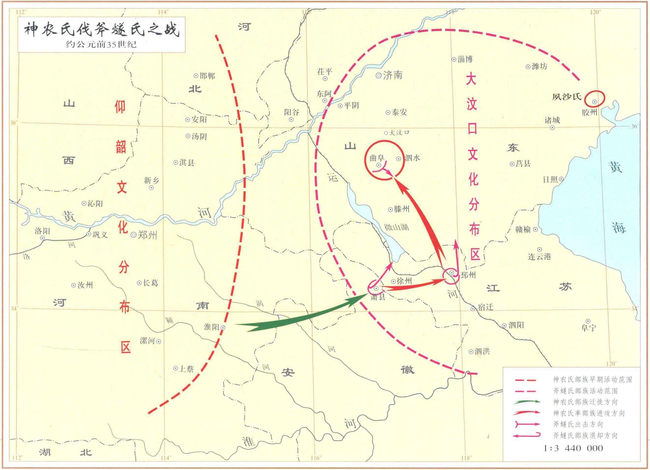 华夏集团中的神农氏部族进至以今淮阳为中心的像东南后,发现淮阳以东的黄淮之间,大多是沼泽地和积水洼,不适于农耕和生活。为开拓生产、生活空间,派出部族中的一部,先行通过沼泽较少的地段,向东扩展。当进至今皖北萧县和苏北邳州一带时,与海岱地区(大汶口文化圈),后世称为东夷集团之斧燧氏部族群的氏族发生矛盾和冲突。斧燧氏不肯屈服,神农氏遂集中主要力量,由今徐州地区沿大野泽东北进攻斧燧氏。在今曲阜南将其击败,遂兼并之。同时神农氏也迁至农、牧、渔业均发达的以曲阜为中心的地区。夙沙氏(今山东胺州附近)等附近部族,有的也主动归附,形成新的部落联合体。