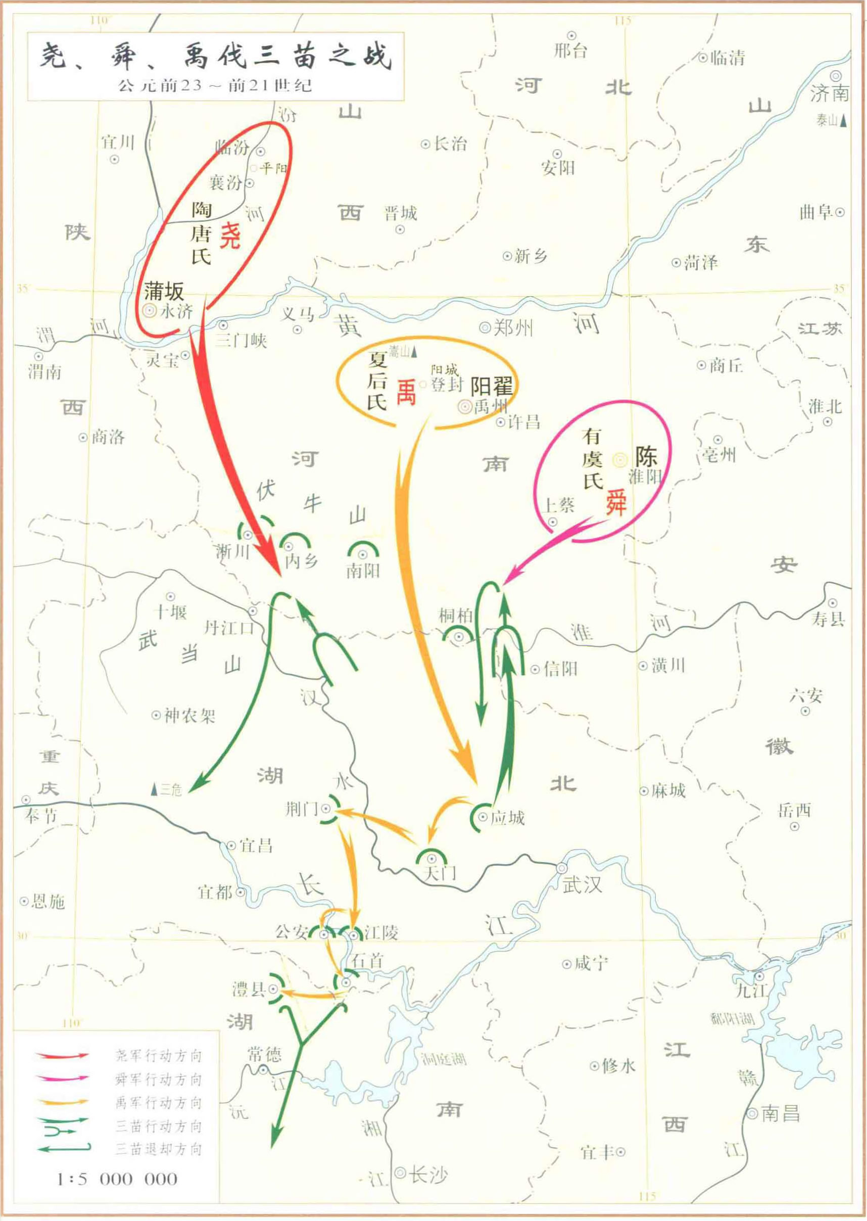 早在公元前4000年前,长江中游(大溪文化圈)的苗族就已有了以湘北澧县为中心的部落联盟。至公元前3000年前后的五帝后期(屈家岭文化时期),已发展为以哪中天门为中心的三苗族联合体。其势力已北扩至像南淅川、内乡、南阳、桐柏等地。为解除三苗对华夏的威胁,尧率中原各族进攻三苗。在淅川、内乡以南的丹江之滨,大败三苗,将其驱逐至三危(渝鄂交界处山区)。豫南三苗各部大都归附,但仍时叛时服。有虞氏继为华夏联合体领袖后,江汉地区的三苗又与像南各部联合向北扩展。舜率众将其击退后,为巩固战果,对像南三苗实施政治争取,将其迁至汝州、禹州以北,郑州、洛阳以南地区,加强交流,变其习俗,使融于华夏族中;对江汉地区三苗,则进行武力打击。但终舜之世,亦未将三苗征服。夏后氏首领禹,在治水和攻苗中有功,继舜为华夏联合体领袖。为了安定南疆、统一江汉,对三苗发动了大规模的进攻。首先击败了汉水以北、实力最强的应城、天门一带的三苗;接着又击败了汉水以南荆门、江陵一带的三苗;最后再击败长江以南公安、石首及被县一带的三苗。三苗中的一部,被并于华夏族中,大部退逃至湘、桂、川、滇地区。禹的威望大增,“四方归之,辟土为王”。为夏王朝的建立奠定了基础。